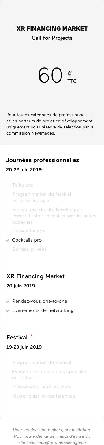 Successfully launched in 2019, the XR Financing Market is the first co-production and funding market entirely dedicated to immersive content. It will give you the opportunity to meet a broad range of international decision makers. In order to find new partners and funding, you will be able to pitch and sell your project to decision makers at personalized meetings (30 minutes) on 10 and 11 June.
